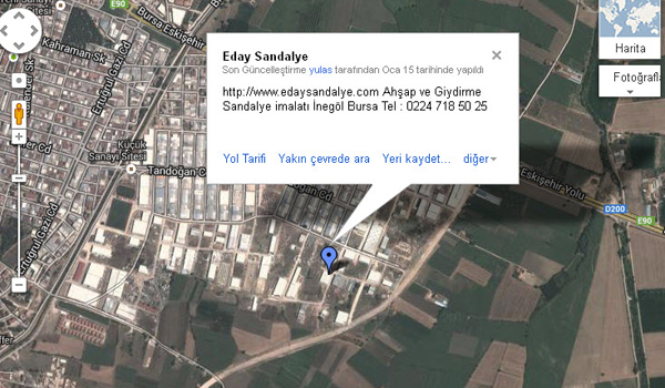 EDAY SANDALYE Küçük Sanayi Sitesi Mahmudiye Mahallesi Tandoğan Caddesi 26. Sokak No:50 İNEGÖL BURSA TÜRKİYE.
